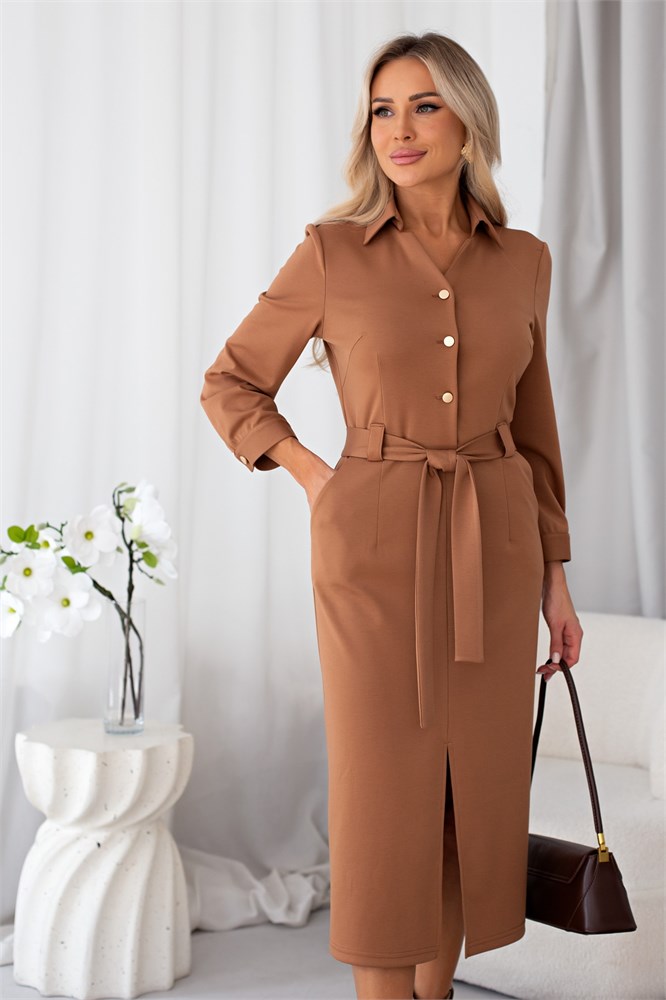 Стильное платье полуприлегающего силуэта. V-образная горловина оформлена отложным воротником на стойке. По переду застежка на петли и пуговицы. Длинный втачной рукав оканчивается притачной манжетой. Модель отрезная по линии талии дополнена шлёвками под пояс. В боковых швах функциональные карманы. Низ ровный, по переду разрез. Пояс из основной ткани в комплекте.