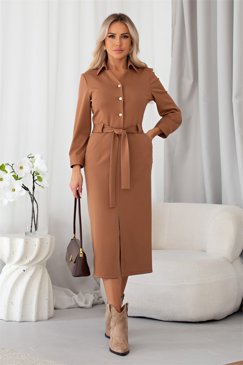 Стильное платье полуприлегающего силуэта. V-образная горловина оформлена отложным воротником на стойке. По переду застежка на петли и пуговицы. Длинный втачной рукав оканчивается притачной манжетой. Модель отрезная по линии талии дополнена шлёвками под пояс. В боковых швах функциональные карманы. Низ ровный, по переду разрез. Пояс из основной ткани в комплекте. Рекомендуемая стирка при t не более 30°. Длина изделия: 117 см. Длина рукава: 62 см. Ткань: трикотаж Рост фотомодели: 168 см Размер фотомодели: 42