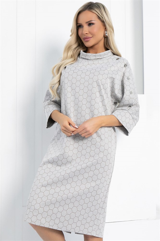 Платье прямого кроя будет уместно как для повседневных выходов, так и для особых случаев! Модель оснащена цельнокроеными рукавами на манжете, длина которых составляет три четверти. Небольшой воротник-хомут дополняет образ, придавая платью изысканный шарм. Декоративные пуговицы, расположенные на линии одного плеча, подчеркивают внимание к деталям.