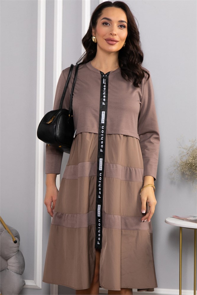 Повседневное платье в стиле спорт-шик, выполненное из сочетания плотного трикотажа и плащевки. Платье отрезное по линии талии, юбка состоит из ярусов. Такой фасон прекрасно подойдёт для повседневных мероприятий, будет хорошо сочетаться как с обувью на плоской подошве, так и с каблуком. Плащевка неприхотлива в уходе, любые брызги или капли с неё можно удалить обычной влажной салфеткой. Молния по всей длине платья также является декоративным элементом.