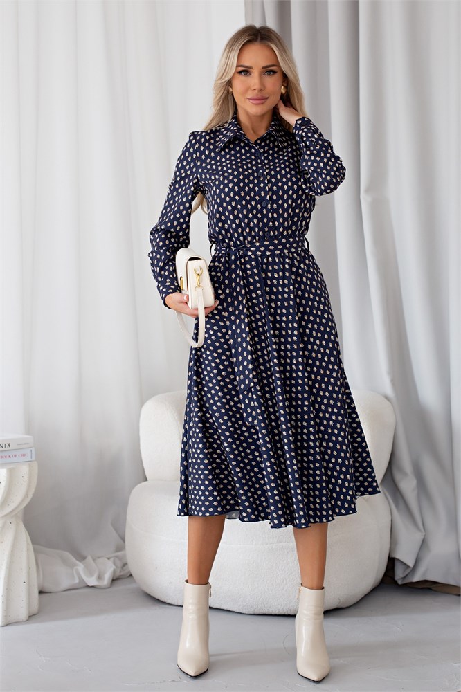 Красивое платье приталенного силуэта из легкой ткани - ниагара. Горловина оформлена отложным воротником на стойке. По переду выполнена планка с застежкой на петли и пуговицы. Длинный втачной рукав, оканчивается притачной манжетой. В боковых швах функциональные карманы. Модель отрезная по линии талии, присобрана на эластичную резинку. Тканевый пояс дополнительно акцентирует талию. Модель прекрасно дополнит ваш гардероб.