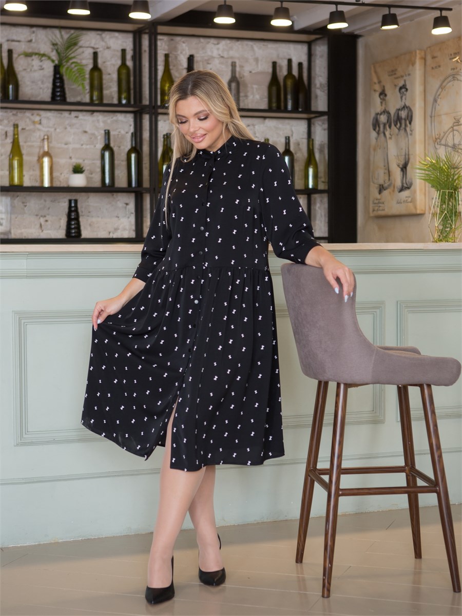 Стильное повседневное платье, свободного силуэта, выполнено из шелковистой плательной ткани. Платье отрезное по линии талии со сборкой по шву притачивания, по спинке линяя талии слегка занижена. Платье с двумя нагрудными вытачками и центральной застежкой на кнопки. Горловина переда и спинки с втачным воротником-стойкой. Платье с удобными карманами в боковых швах. Рукав втачной длиной 3/4 с притачным манжетом по низу. Манжеты застегиваются на кнопки. Длина рукава от плеча в 48 р-ре – 41 см. в 64 р-ре – 47 см., ширина рукава по низу в 48 р-ре – 23 см. в 64 р-ре – 30 см. Платье без подклада. Длина изделия по спинке в 48 р-ре – 105 см. в 64 р-ре – 117 см. Состав ткани: Полиэстер 80% Вискоза 20%