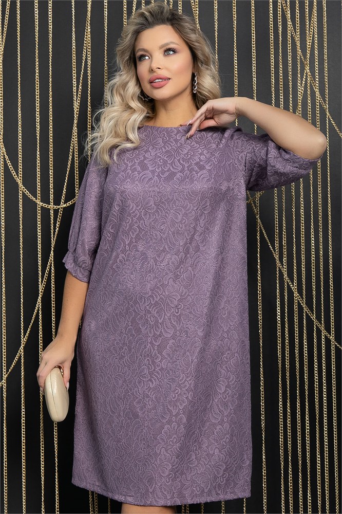 Очаровательное платье в сиреневом оттенке. Оно прямого силуэта, рукав 3/4 с манжетом. Вырез округлый, сзади на пуговице. Выполнено с нежным кружевом на трикотаже и легким блеском, идеально для торжеств и других мероприятий. Станет вашей визитной карточкой, подчеркивая вашу красоту и уверенность в себе. По бокам разрезы.