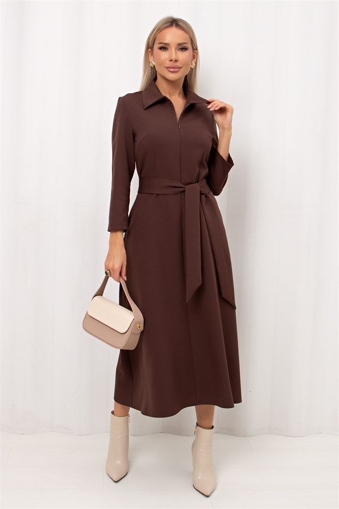 Повседневное платье приталенного силуэта изготовлено из плательно-костюмной ткани. Горловина оформлена отложным воротником. По переду переда застежка на потайную молнию. Втачной рукав длиной 7/8. Модель отрезная по линии талии. В боковых швах функциональные карманы. Пояс из основной ткани в комплекте. Рекомендуемая стирка при t не более 30°. Длина изделия: 123 см Длина рукава: 49 см Рост фотомодели: 168 см Размер фотомодели: 42 Ткань: плательно-костюмная.