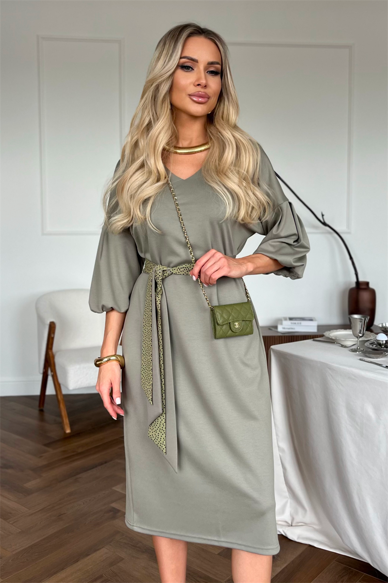 Элегантное платье прямого силуэта изготовлено из трикотажного полотна. V-образная горловина на внутренней обтачке. Втачной рукав фонарик со спущенным плечом. Низ ровный, без разрезов. Модель дополняет пояс с отделкой. Рекомендуемая стирка при t не более 30°. Длина изделия: 108 см. Длина рукава: 48 см. Ткань: трикотаж Рост фотомодели: 168 см Размер фотомодели: 42