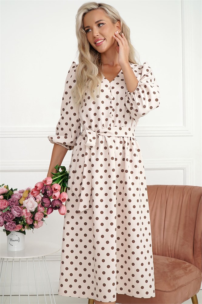 Это красивое платье в горох — отличный выбор для тех, кто ценит стиль и комфорт. Изготовлено из ткани, имитирующей лен, оно обладает легкой текстурой и приятным на ощупь материалом, что делает его идеальным для теплых дней. Пояс из основной ткани входит в комплект. Декоративные пуговицы по переду добавляют платью изысканности и оригинальности, подчеркивая его уникальный дизайн. Резинка по талии обеспечивает идеальную посадку, акцентируя фигуру и создавая элегантный силуэт.