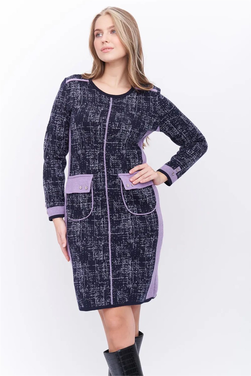 Вязаное платье женское полуприлегающего силуэта длиной до колена. Рукава втачные длинные. Горловина круглая, обработана бейкой. Накладные карманы с отворотом. Жаккардовое переплетение. Контрастная отделка. Платье вязаное из полушерстяной пряжи и подходит для использования в зимний период.