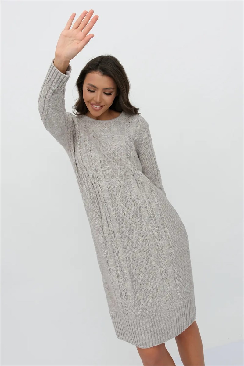 Вязаное платье женское полуприлегающего силуэта . Рукава втачные длинные. Горловина круглая, обработана бейкой. Платье с фактурным узором косами станет украшением вашего осеннего гардероба. Женское вязаное платье изготовлено из мягкой и приятной к телу турецкой пряжи с содержанием шерсти.и подходит для использования в зимний период.