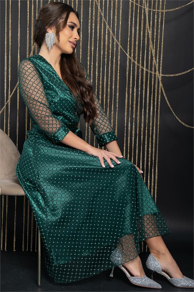 Летящее женственное платье украсит Ваш образ в новогоднюю ночь. Такая модель платья хороша тем, что актуальна на любом празднике, а также выглядит женственно, элегантно и празднично. Платье свободного кроя с длинным рукавом, по низу манжет. Имеет V-образный вырез с имитацией запаха, который подчеркнет вашу зону декольте. Изделие на подкладе. В комплект входит пояс из атласа.