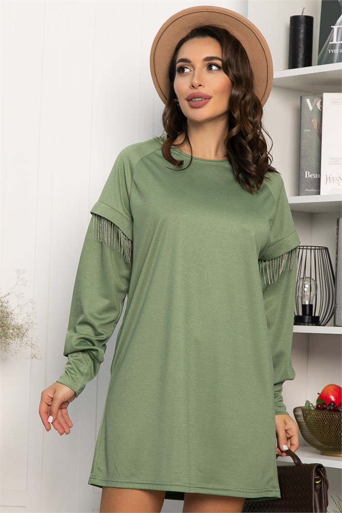 Трикотажное платье свободного кроя — это отличный выбор для создания стильного и комфортного образа! Его отличительной чертой является эффектная металлическая бахрома, которая придаёт ему оригинальности. Модель оснащена удобными боковыми карманами. Элегантные рукава с высокой манжетой не только добавляют образу изысканности, но и защищают от холода.