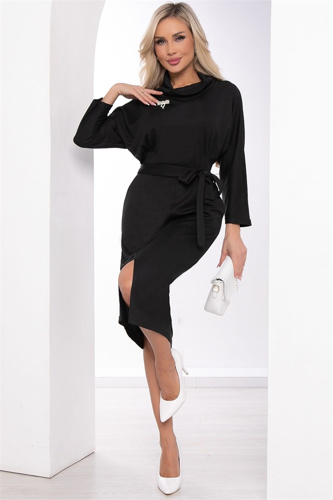 Элегантное трикотажное платье стильного кроя. Модель такую можно носить в офис или на деловую встречу. Цельнокроеный рукав и отрезная линия по талия с защипами, что придает платью легкий объем. По переду изделие дополняет элегантный разрез, который придает образу игривости. По бокам платья карманы. Пояс из основной ткани и украшение входят в комплект.