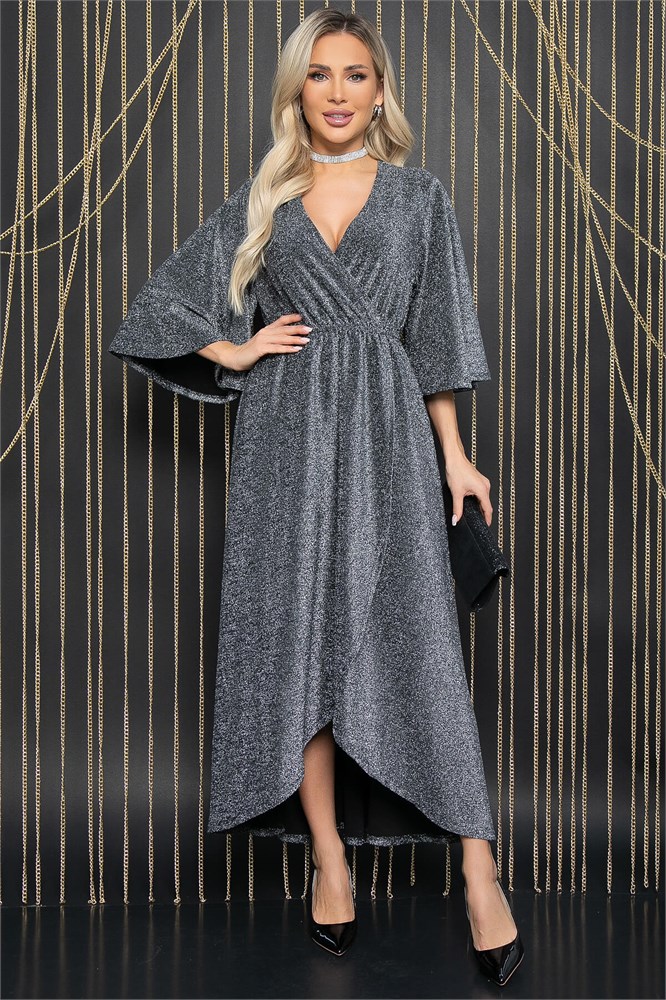 Эффектное праздничное платье, выполненное из трикотажа с люрексом, которое привлечет всеобщее внимание благодаря своему деликатному блеску. Платье отрезное под грудью на резинке, который создает идеальную посадку и подчеркивает талию. Лиф выполнен на запахе, добавляя образу нотки романтики. Рукав скроен по типу «крыло» придает платью нежность и легкость, а свободная летящая юбка на запахе обеспечивает комфорт и элегантность в движении.