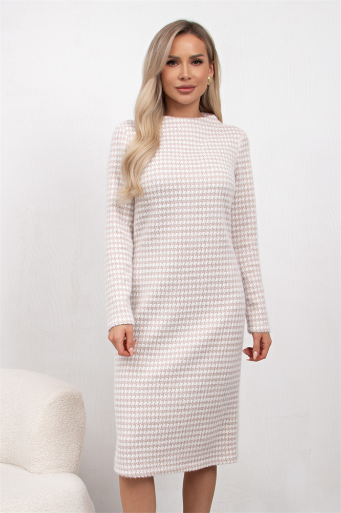 Комфортное платье прямого силуэта выполнено из трикотажного полотна Ангора. Горловина оформлена цельнокроеной стойкой - лодочка. Длинный втачной рукав. Низ ровный, без разрезов.