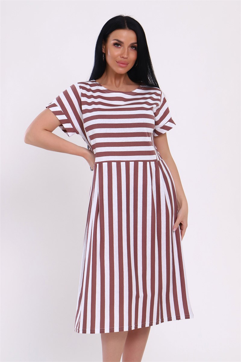 Платье женское из кулирки с принтом в виде ярких широких полос. Модель свободного кроя, с завышенной отрезной талией со складками. Круглая горловина, спущенная пройма обработана широким манжетом, на передней полочке рельефы. Разное направление полос делает платье стильным и привлекательным. Лёгкое, воздушное, приятное к телу платье, необходимая вещь в женском летнем гардеробе.