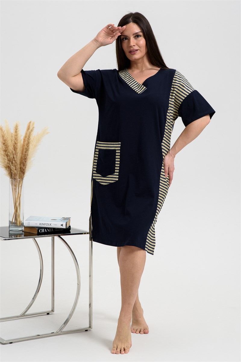 Платье прямого силуэта, с V-образной горловиной спереди, с разрезами в нижней части боковых швов. На полочке расположен фигурный двойной накладной карман. Рукав короткий. Горловина полочки обработана обтачками. Горловина спинки обработаны бейкой из основного полотна.