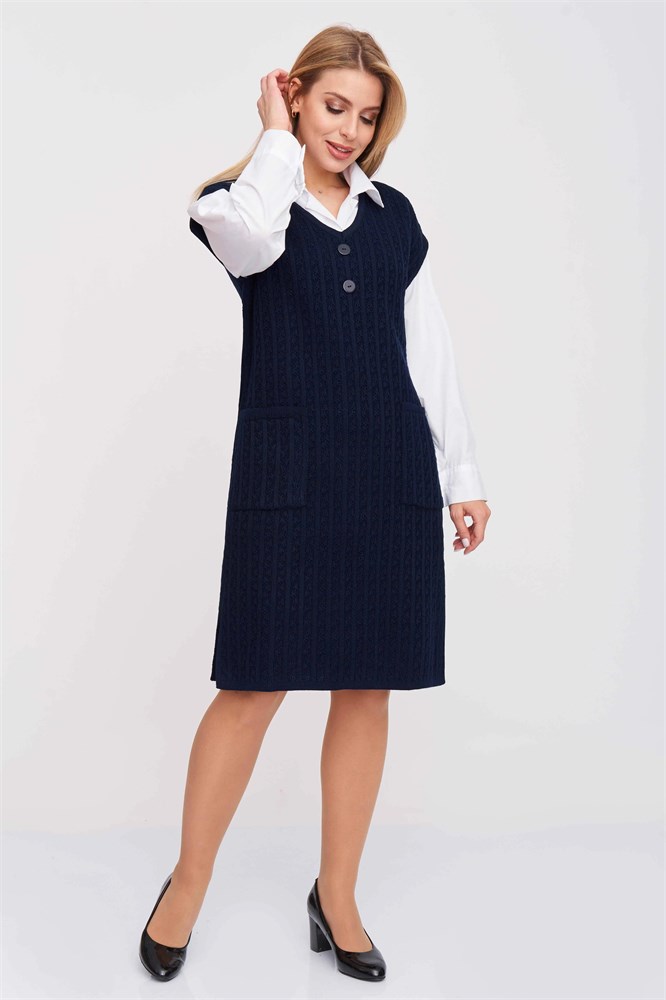 Женский вязанный сарафан длиной до колена и разрезами по боковым швам. Плечо спущенное без рукавов с v-образным вырезом горловины. По центру переда расположены декоративные пуговицы. Сарафан выполнен структурным переплетением.