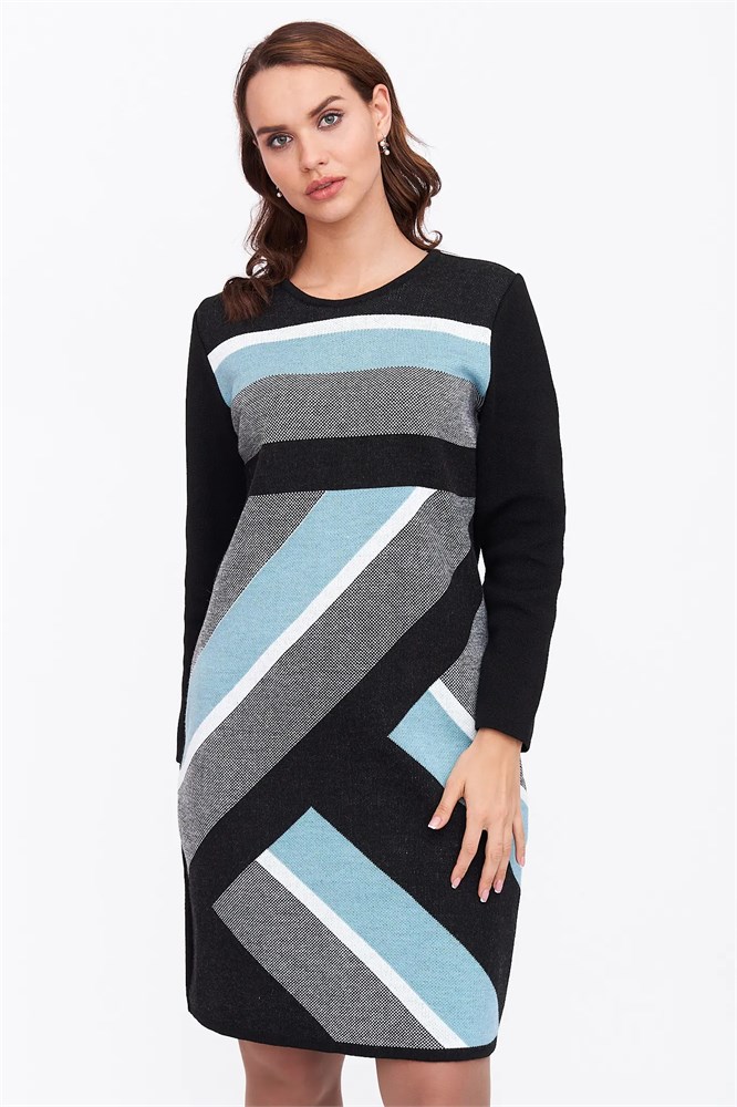 Вязаное платье женское полуприлегающего силуэта длиной до колена. Рукава втачные длинные. Горловина круглая, обработана бейкой. Жаккардовое переплетение из диагональных полос контрастного цвета. Платье вязаное из полушерстяной пряжи и подходит для использования в зимний период.
