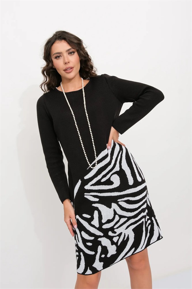 Женское трикотажное платье полуприлегающего силуэта. Вырез горловины круглый, рукава втачные длинные. Платье выполнено жаккардовым переплетением с элегантным переходом от однотонного черного верха к бело-черному низу изделия.
