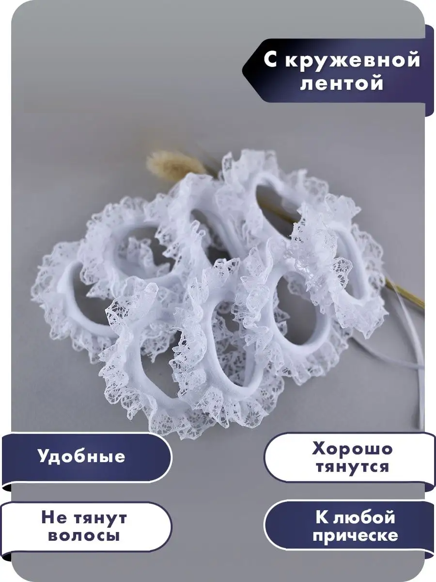 Удобные небольшие бантики резинки для девочек белого цвет. С кружевным обрамлением. Набор бантов резинок для волос состоит из 2 шт. Подойдут девочкам к школьной форме, платью и другой повседневной одежде. Получается очень красивый и модный образ. Размер резиночки для волос приблизительно 7 см, по внутреннему диаметру около 5 см, имеют круглую форму, тканевую основу, маленькие (не совсем мелкие), легкие, мягкие, тонкие. К резинкам по внешнему контору прикреплены кружевные ленты. Кружева придают резинкам праздничный вид. Сочетаются с другим украшением, бантиками для девочек. Можно делать гимнастические, спортивные прически для тренировок, художественной гимнастики и фитнесса.