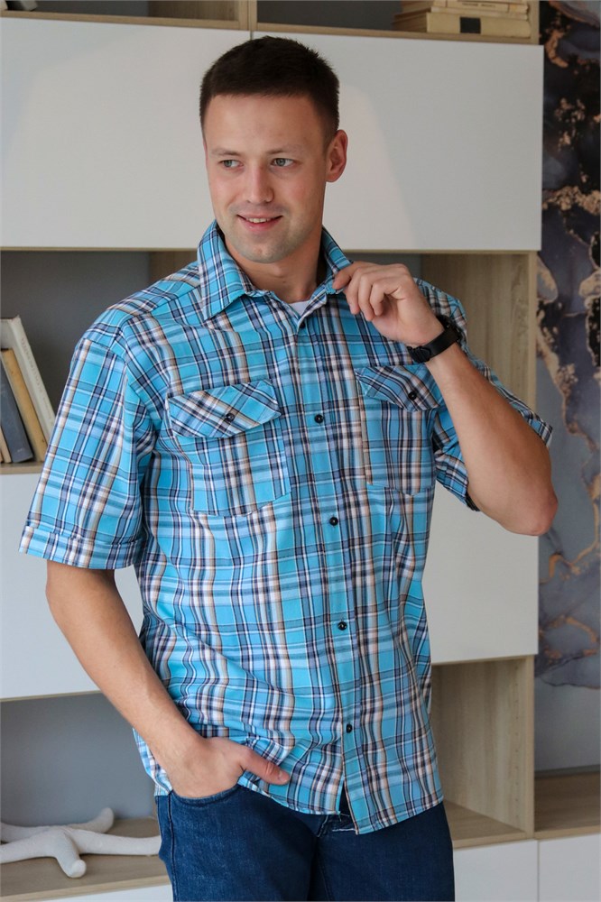Мужская рубашка в клетку с коротким рукавом. Ткань шотландка 100% хлопок. Модель свободного кроя, дополнена двумя накладными карманами и клапанами с пуговицей. Планка на полочке цельнокроеная, застегивается на пуговицы. Плечо приспущено, рукав с цельнокроеной планкой. Воротник на стойке, проложен флизелином с отстрочкой. Низ изделия застрачивается швом вподгибку при помощи специального приспособления. Внимание! Данный товар по цвету не подбирается.