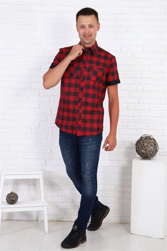 Рубашка мужская с черно-красной клеткой, рукав короткий с манжетом, на груди 2 кармана с пуговицами, низ рубашки овальный.