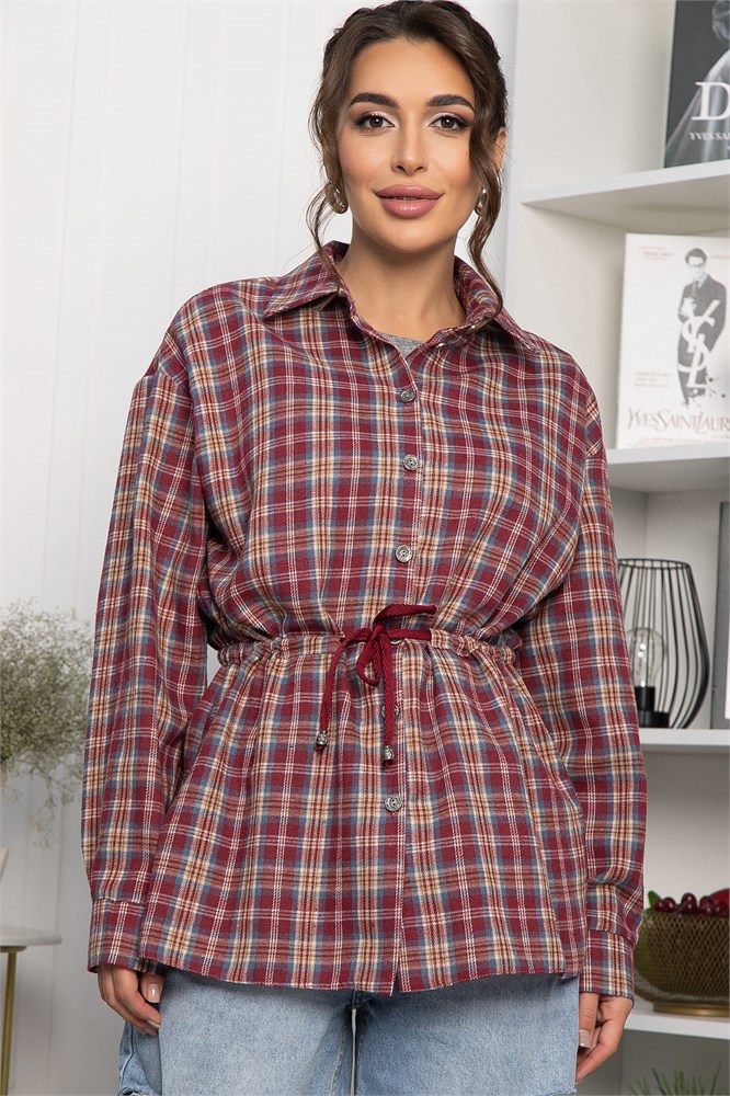 Рубашка в клетку в винном цвете станет стильным акцентом в вашем гардеробе, позволяя экспериментировать с разными образами. Её можно носить как самостоятельный элемент или использовать в многослойных ансамблях. По бокам есть разрезы. Рубашка с воротником-стойкой и аккуратной застежкой на пуговицы выглядит современно и элегантно. Спущенное плечо добавляет расслабленности, а кулиска на талии подчеркивает фигуру. Создайте свой уникальный стиль с нашей новой клетчатой рубашкой!