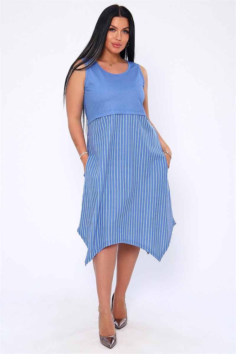 Женский летний сарафан - платье А - силуэта с завышенной талией и небольшой декоративной складкой на кокетке переда с боковыми карманами в шве. Низ изделия выполнен с угловыми вырезами. Сшит из трикотажного полотна, 100%-го хлопка, что позволяет телу дышать и чувствовать себя комфортно в жаркий день. Длина изделия ниже колена. Удобный сарафан, приятный к телу, не стесняет движения. Любителям носить одежду в обтяжку можно брать на размер меньше. Подойдет на любую фигуру, скроет недостатки. Отлично смотрится на беременных. Приятные и стойкие цвета ткани. Широкий размерный ряд 44-56. Для дома и дачи, для отдыха и прогулок, в отпуск, на море. Отличный подарок любимым девушкам и женщинам!