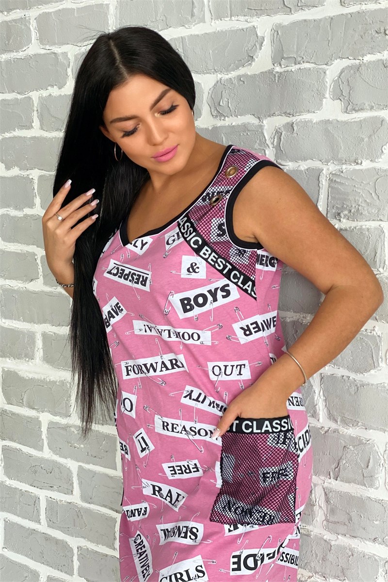 Сарафан женский полуприлегающего силуэта, с кокетками и накладными карманами, декорированными тканью-сеткой и крупными люверсами. По низу изделия разрезы в боковых швах.