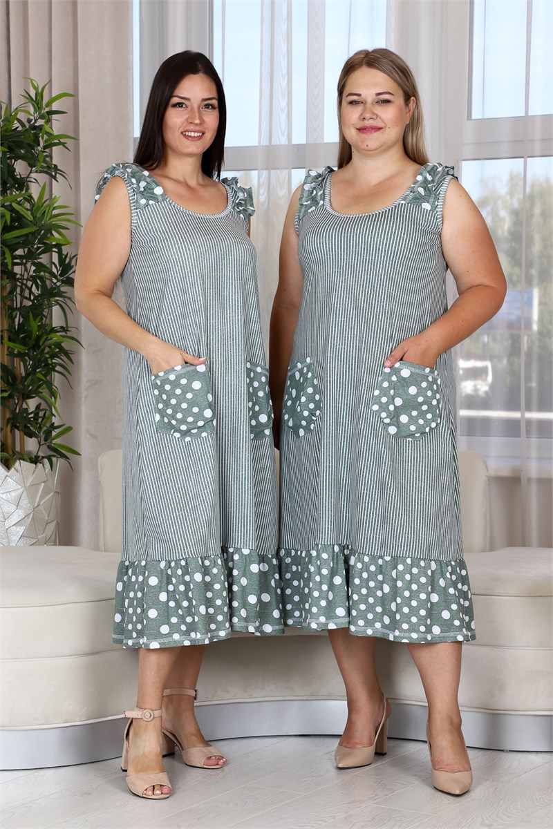 Сарафан женский, слегка расширенный к низу. На полочке два накладных кармана. Сарафан из актуальной сейчас ткани в полоску, а на широких бретелях и по низу изделия рюша в горошек.