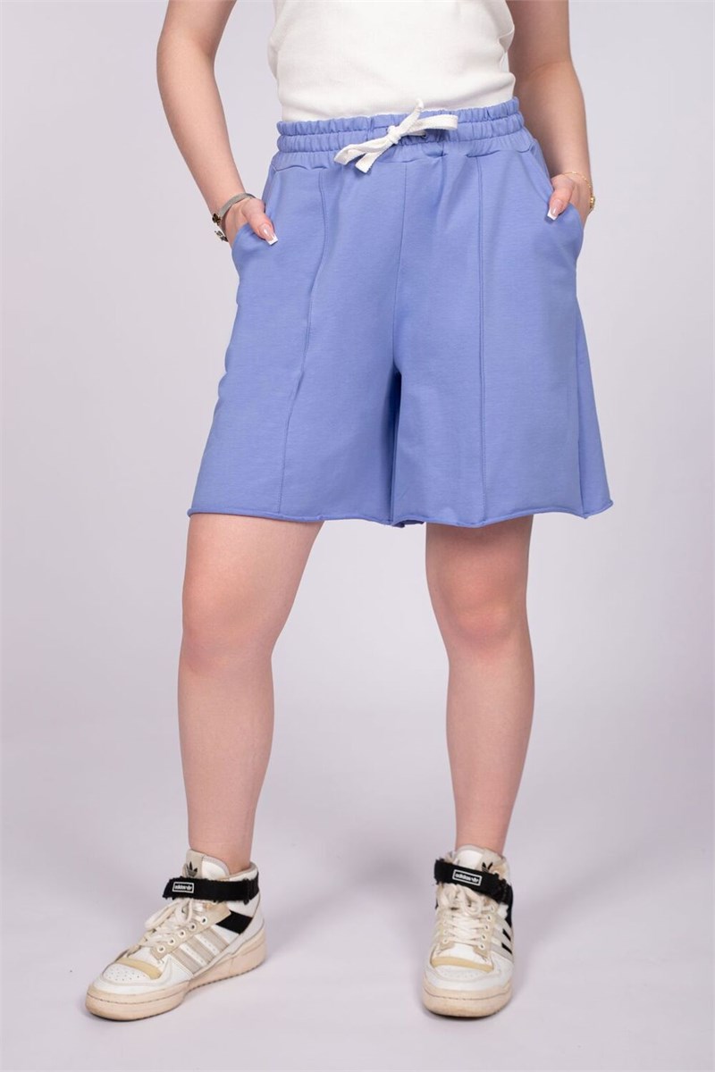 Шорты женские трапециевидного силуэта. Пояс отрезной в цвет изделия, выполнен из основного полотна, с эластичной тесьмой внутри. По поясу шорт вставлен плоский утягивающий шнурок, цвет серый меланж, низ шнурка подвернут и застрочен. Вдоль пояса шнурок закреплен отстрочкой на поясной машине. По центру передней и задней половинке шорт защип. На изделии выполнены карманы с отрезным бочком и отлетной мешковиной, вход в карман обтачной. Низ изделия не обработанный край. Модель рассчитана на рост 164-170