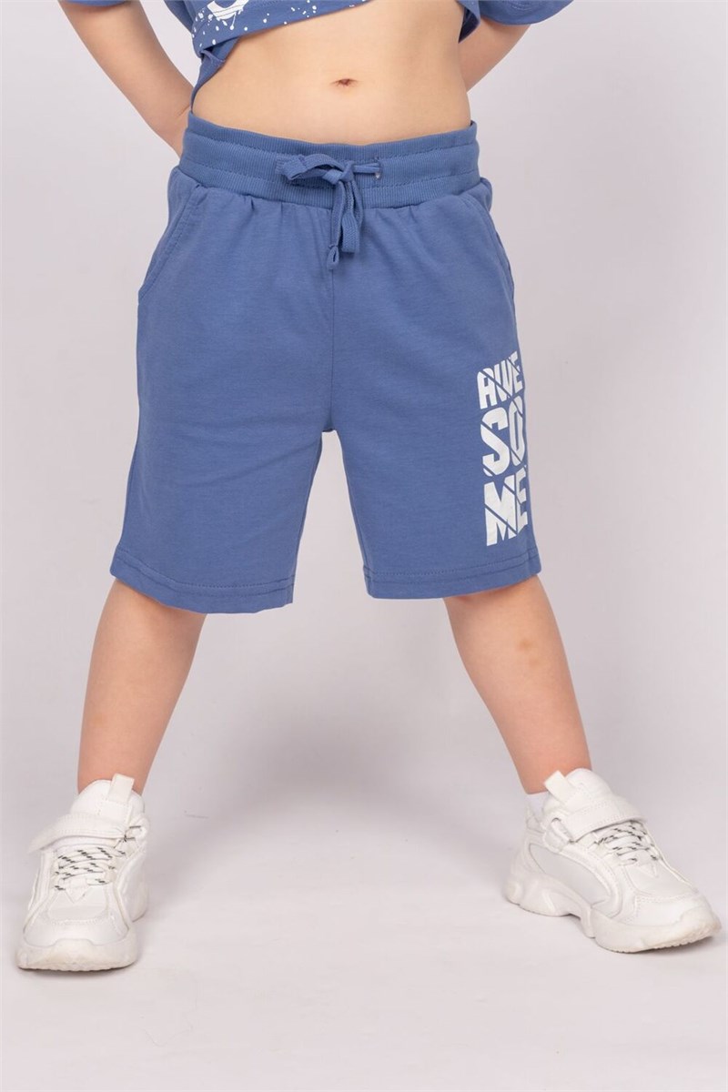Шорты для мальчика прямого силуэта. Отрезной пояс, в цвет изделия, из кашкорсе с эластичной тесьмой внутри. По поясу шорт вставлен плоский утягивающий шнурок. Длина шнурка = длина пояса + 45 см для возможности завязывания. На передней половинке шорт карманы с отрезным бочком, вход в карман обработан строчкой. Низ изделия обработан швом в подгибку. На левой передней половинке шорт принт шелкография. Надпись переводится как Потрясающий.