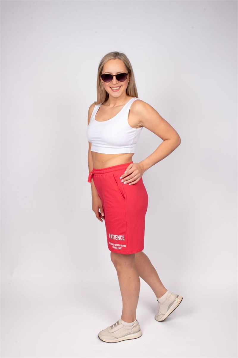Шорты женские прямого силуэта. Отрезной пояс из основного полотна, с эластичной тесьмой закрепленной в шов. По поясу шорт вставлен плоский утягивающий шнурок, в цвет пояса. На передней половинке шорт выполнены карманы с отрезным бочком. Низ изделия обработан швом в подгибку. На левой передней половинке шорт принт шелкография. Надпись переводится как Терпение; Ничто тоящее не делается легко. Модель рассчитана на рост 164-170см.