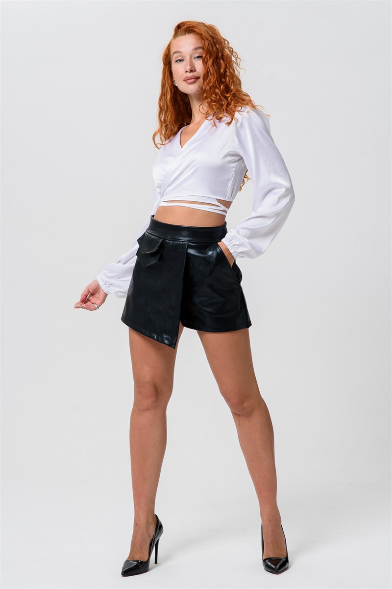 Юбка-шорты выполнены из экокожи - идеальный вариант женской одежды на весну, лето,осень и зиму. Эта базовая классика одежды на каждый день. Прямой крой с поясом создает плотную посадку на бедрах и талии. Застёжка на молнии сзади придаёт особой оригинальности модели.