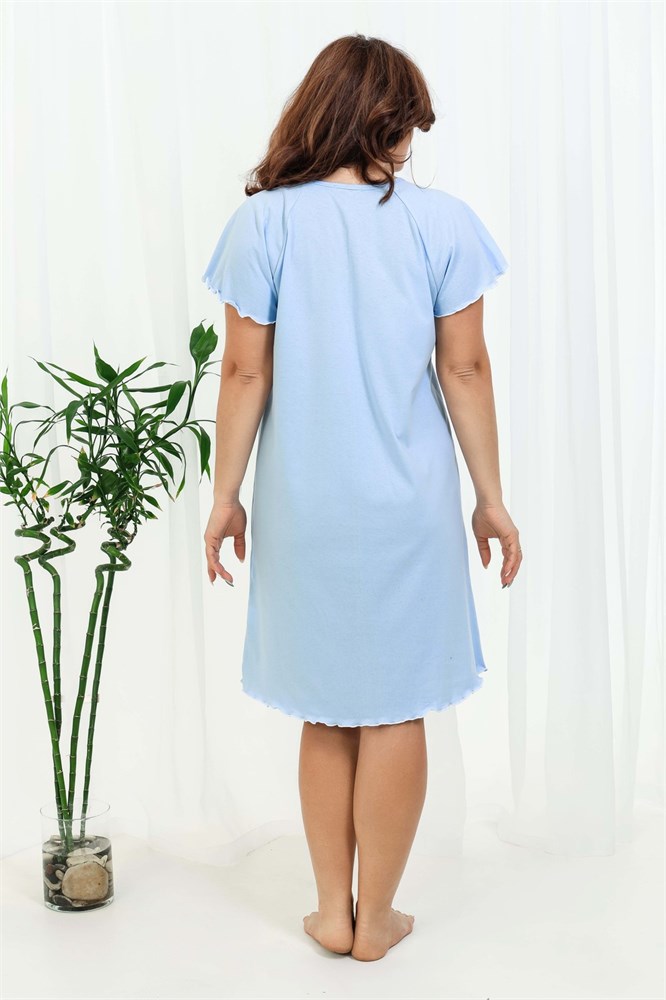Сорочка женская с симпатичной рюшей по горловине. Очень свободный и удобный крой. Рукав - реглан не стесняет движения рук. Обработка рукава и низа изделия в виде лёгкой волны придаёт лёгкость и воздушность. Шикарный принт в виде россыпи незабудок. Оттенок ментола может отличаться от фото