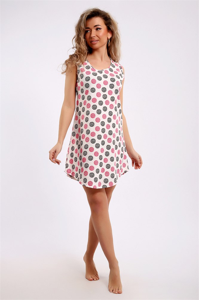 Сорочка маечного фасона без рукавов. Подол немного закруглен. Подходит для сна и отдыха.