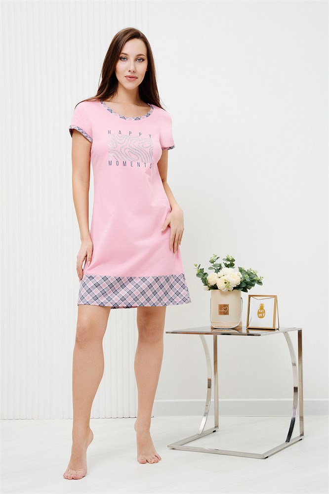 Сорочка женская из кулирного полотна, состав 100% хлопок. Сорочка свободного кроя, слегка расширена книзу, горловина круглая, спущенное плечо, нижняя часть туники из отделочного материала, подогнута на плоскошовной машине. В этой сорочке вам будет удобно и уютно, легкая в уходе.