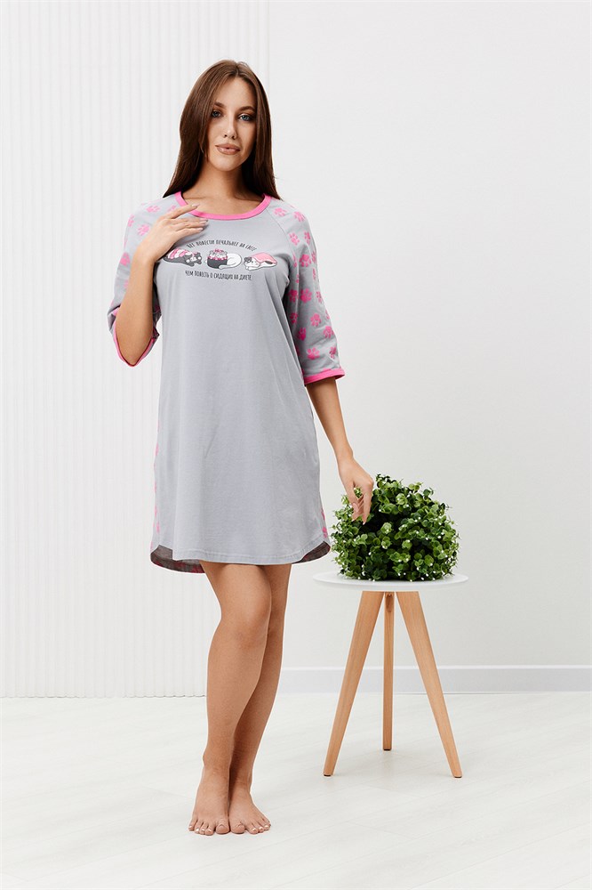 Сорочка женская, состав 100% хлопок. Силуэт сорочки прямой, слегка расширен книзу, горловина и низ рукавов обработаны окантовкой, рукав реглан, низ сорочки обработан на плоскошовной машине, на полочке принт. Идеальный вариант для дома. Изделие легкое в уходе.