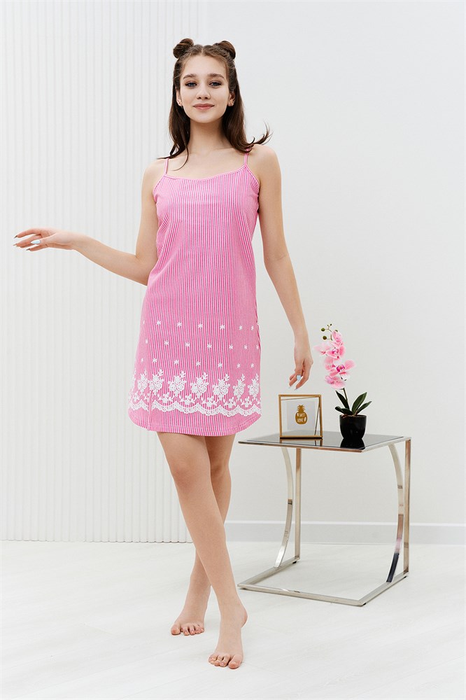 Сорочка на бретелях полуприлегающего силуэта, с фигурной линией низа, длиной выше колена. На полочке внизу обработан декоративный разрез. Проймы, бретели и разрез на полочке обработаны бейкой из основного полотна.