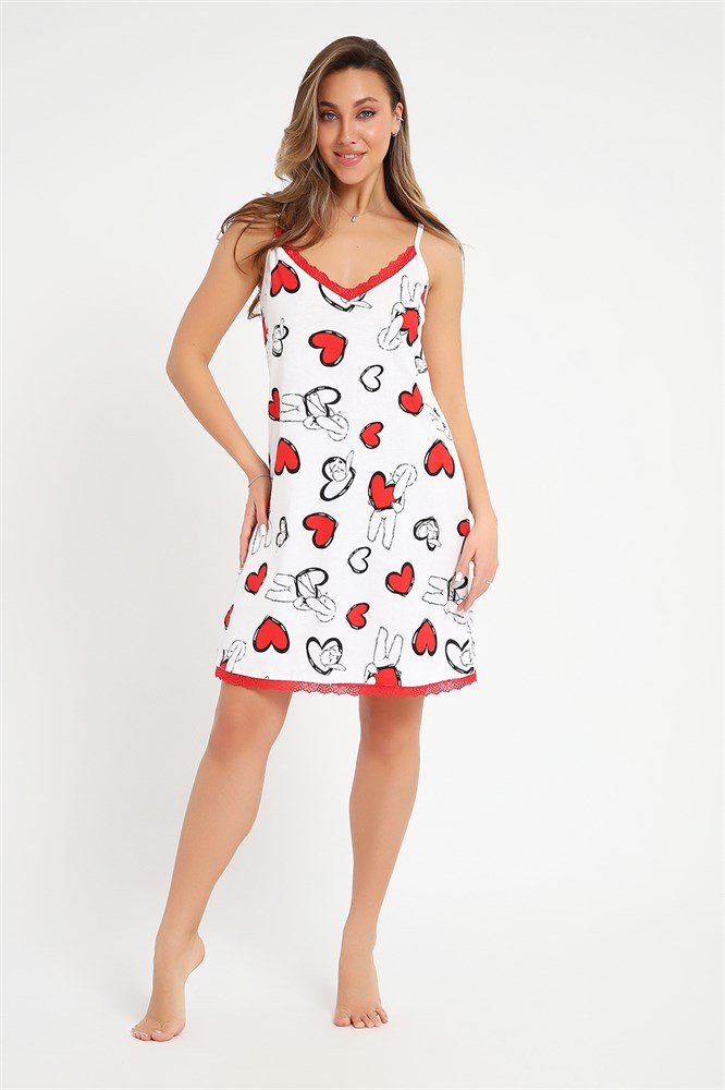 Сорочка женская с V- образным вырезом на бретелях. Данная модель выполнена из трикотажного полотна кулирка (хлопок 100%). Горловина обработана эластичным кружевом. Очень приятная и милая моделька порадует вас.