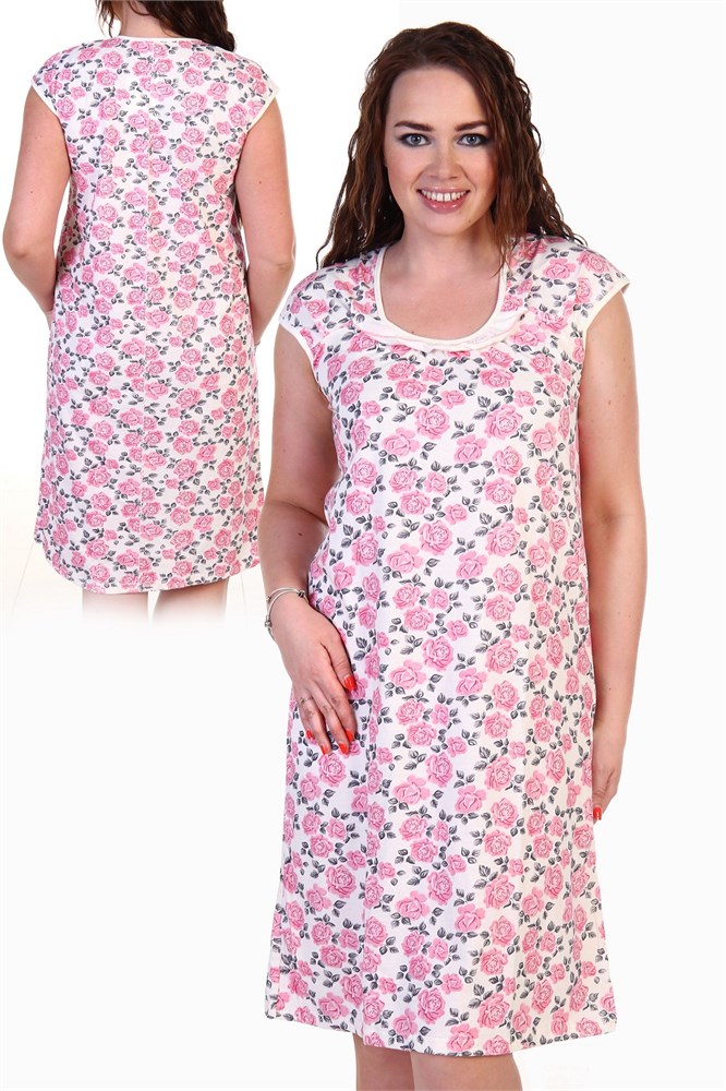 Женская сорочка из кулирки. Рукава очень короткие, окантовка, цветочный дизайн, две расцветки розовая и шоколадная, общая длина приблизительно до коленей. Размеры от 44 до 62.