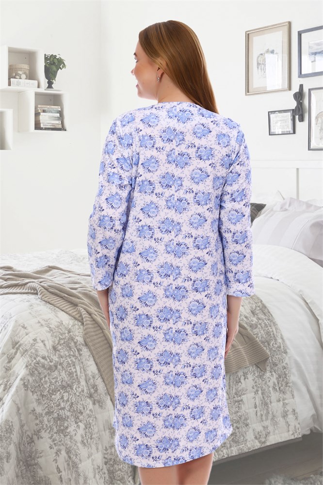 Ночная сорочка из футера с длинным рукавом. На кокетке планка с тремя пуговицами. Воротник декорирован кружевом. По линии отреза лифа небольшая сборка.