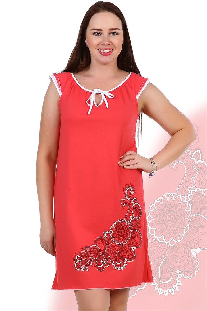 Сорочка женская из кулирки. Светлая окантовка, рукава отсутствуют, на горловине завязки, принт в виде цветов, несколько вариантов расцветки, общая длина чуть выше коленей. Размеры от 44 до 60