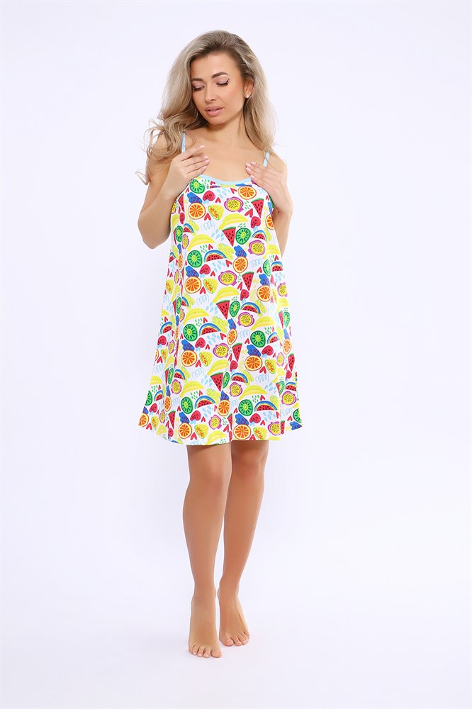 Сорочка женская на бретельках. Яркая расцветка с тропическими фруктами и ягодами.