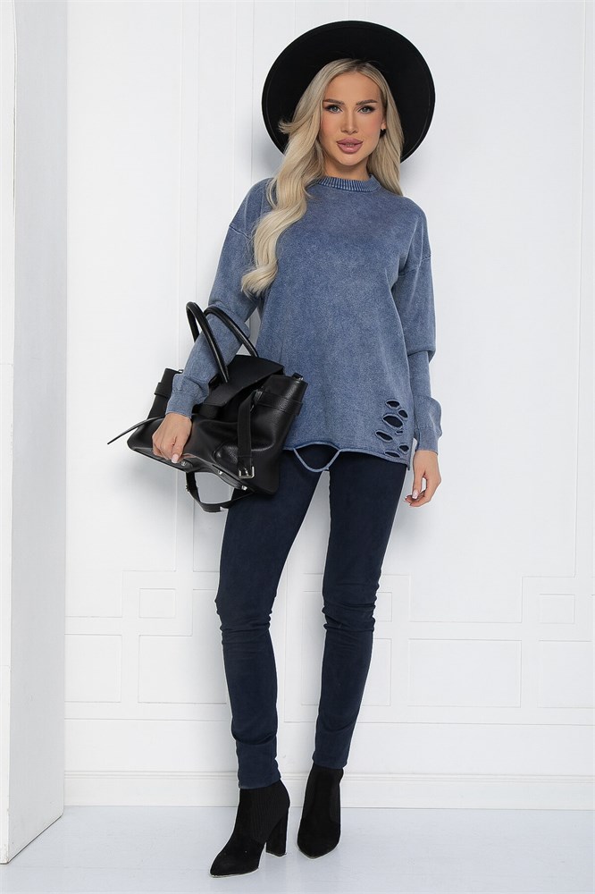 Свитшот в джинсовом оттенке — это незаменимый элемент гардероба любой модницы. Подходит для повседневной носки, а также может быть использован как элемент спортивного или кэжуал-стиля. Особенно эффектно смотрятся рваные элементы, которые делают свитшот одним из самых трендовых предметов женской одежды. Рукава длинные, вырез горловины округлый.