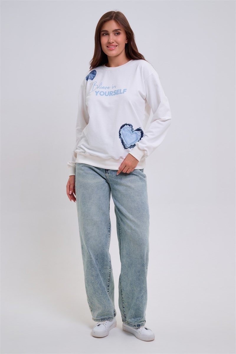 Женский свитшот свободного прямого кроя с круглой горловиной и слегка приспущенными плечами. Спереди нанесён принт в виде сердец и надписи. Выполнен из мягкого и приятного материала футера 2-х нитки, обеспечивающего дополнительный комфорт и сохранение тепла даже в холодную погоду. Доступен в сдвоенных размерах, что удобно для подбора идеальной посадки. Подходит как для повседневной носки, так и для создания эффектных образов в любом стиле.