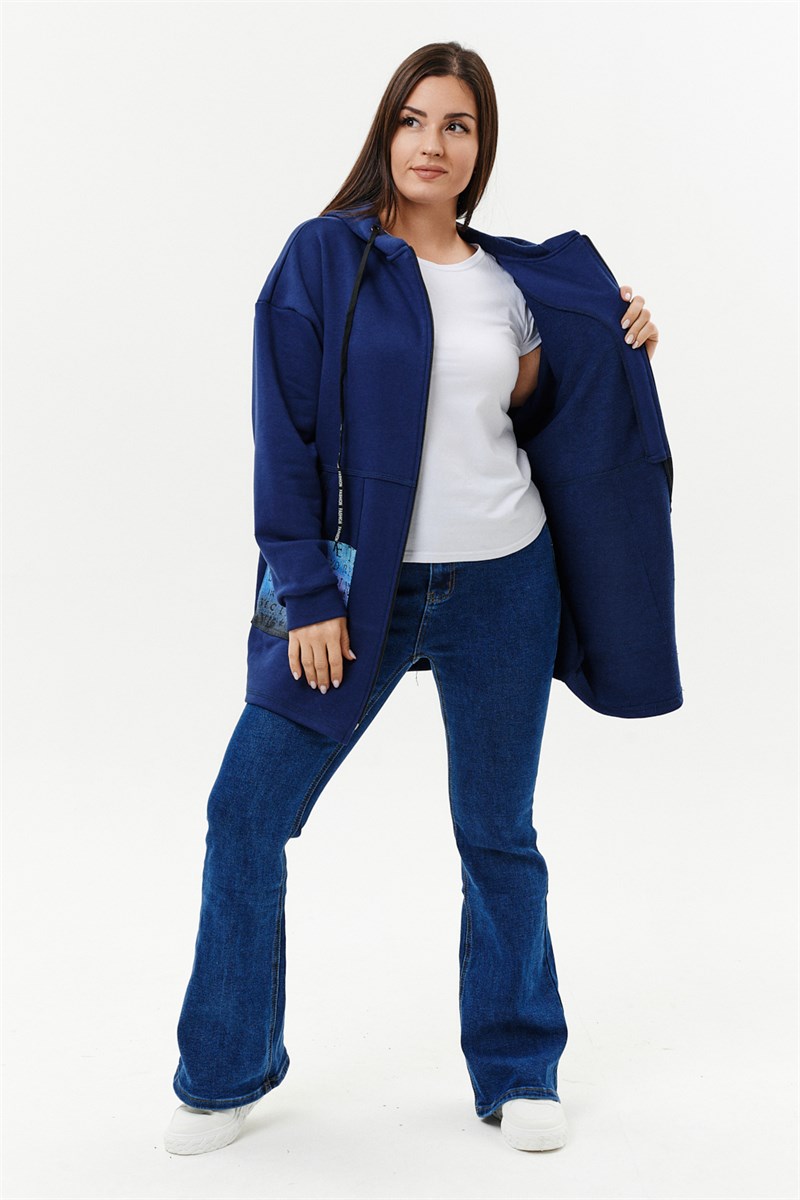 Толстовка женская прямого силуэта до линии бедер, в нижней части заужена по бокам. Рукав втачной с заниженной линией плеча, с манжетой. Капюшон с люверсами и декоративными шнурками с надписью. Застежка на тесьму-молнию. В нижней части полочки два накладных кармана со стильным принтом. Материал - футер 3-х нитка петля.
