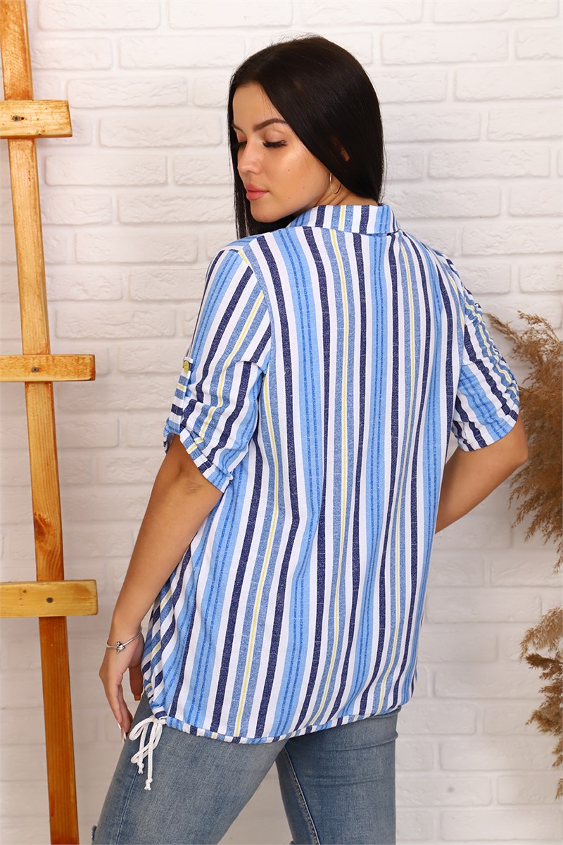 Женская стильная туника рубашечного плана из 100% хлопчатобумажного полотна в полоску. Рукав 3/4 с патами на пуговицах, горловина с втачной V - образной планкой и отложным воротником. Низ изделия на шнурке. Вряд ли можно найти другой предмет одежды, который имел бы такое огромное количество вариаций, как женская туника-рубашка, сочетающая в себе лёгкость, нежность и женственность.