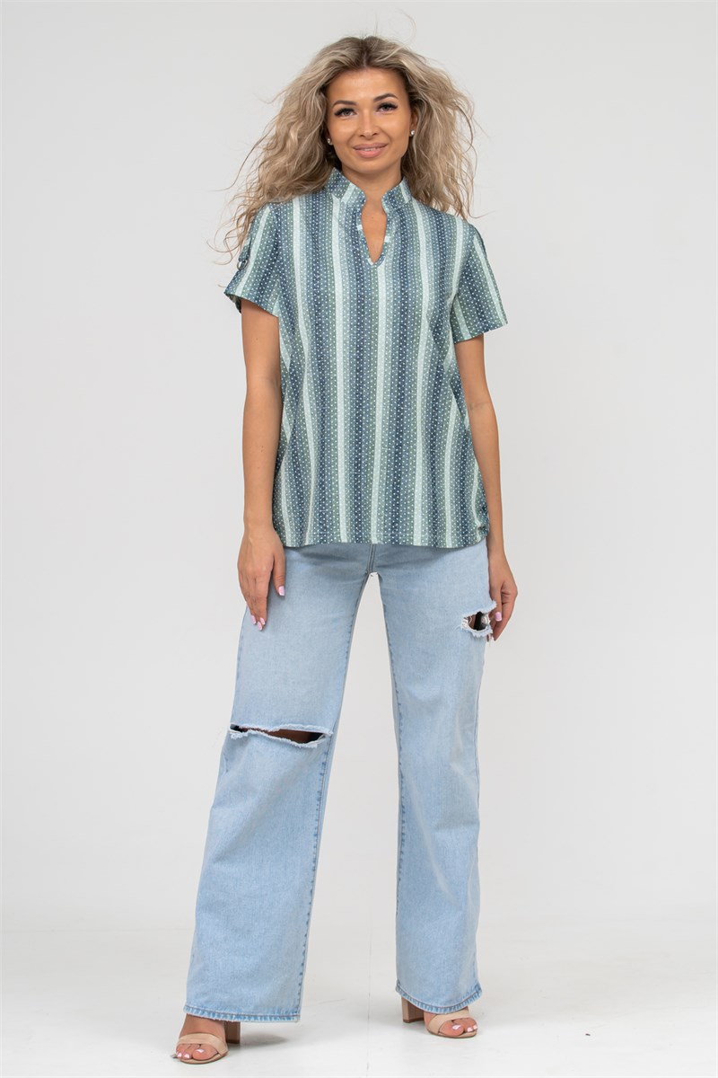 Женская туника-рубашка из 100% хлопчатобумажного полотна, сочетающая в себе всеми любимую полоску и не выходящий из моды горошек. Горловина с V - образным вырезом и воротником стойкой. Рукав и низ изделия с отделкой в виде полуколец, что делает тунику более привлекательной и по-своему красивой.