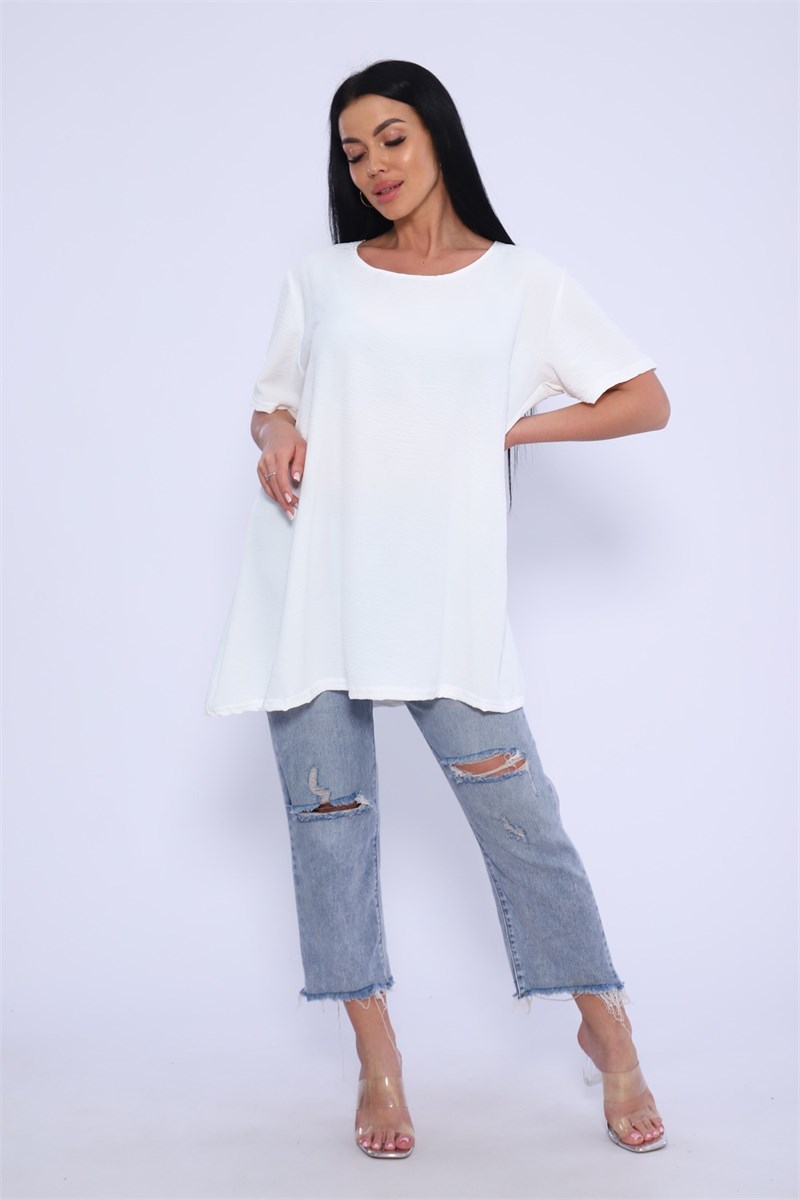 Туника удлиненная женская свободного кроя. Изделие имеет фигурный низ, А-силуэт, короткий рукав и округлая горловина. Туника выполнена из сингапура - легкой и приятной летней ткани. Такая модель подойдет для повседневной носки, как и по дому, так и на улице.