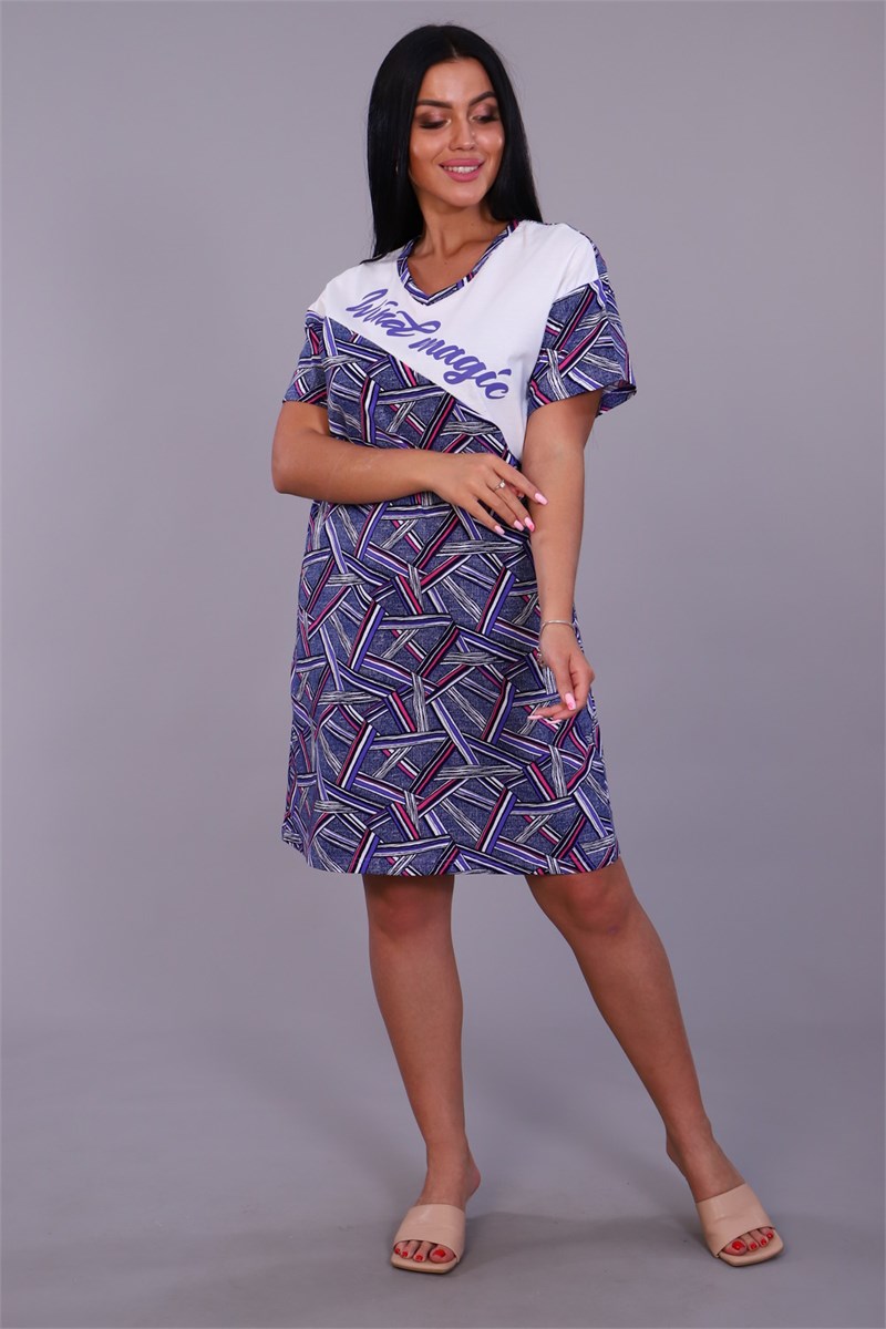 Туника слегка трапециевидной формы, оригинальный асимметричный крой полочки с принтом. Рукава короткие. Без застёжек.